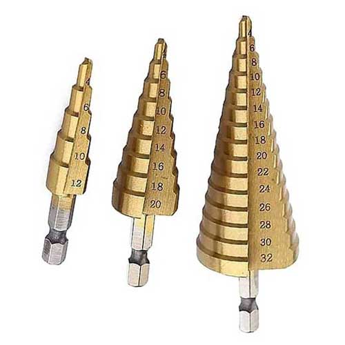شامل سه عدد مته مخروطی: 5 پله 4-12 میلی متر، 9 پله 4-20 میلی متر و 15 پله 4-32 میلی متر